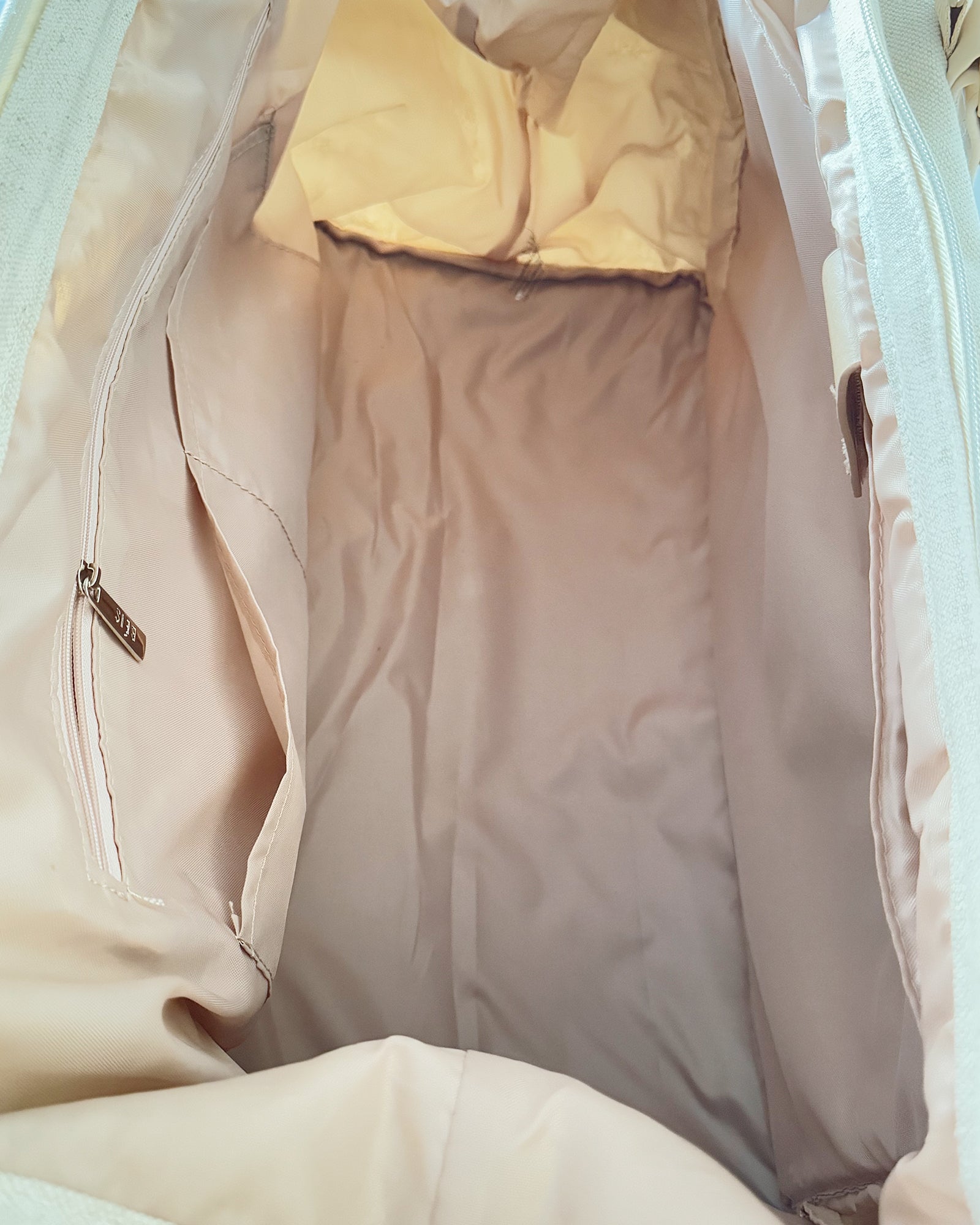 o Fabric: Poly canvas body, vegan leather trim, 100% poly lining, nylon zipper, and zinc alloy hardware.