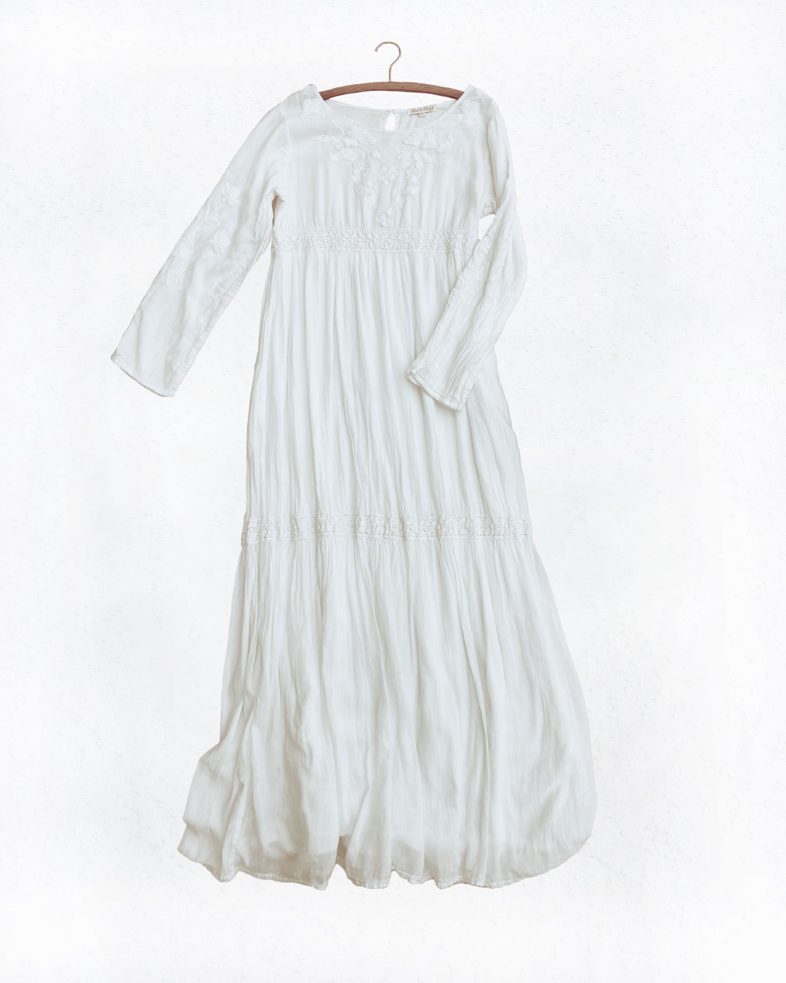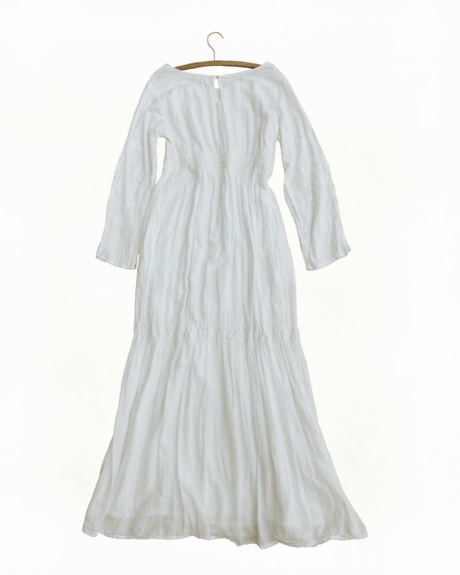 This exquisite cotton maxi dress effortlessly channels a vintage-inspired, cottage core aesthetic, blending timeless elegance with whimsical charm. Its intricate floral embroidery and flowing silhouette evoke the romance of days gone by, making it a perfect choice for both leisurely afternoons and special occasions.
