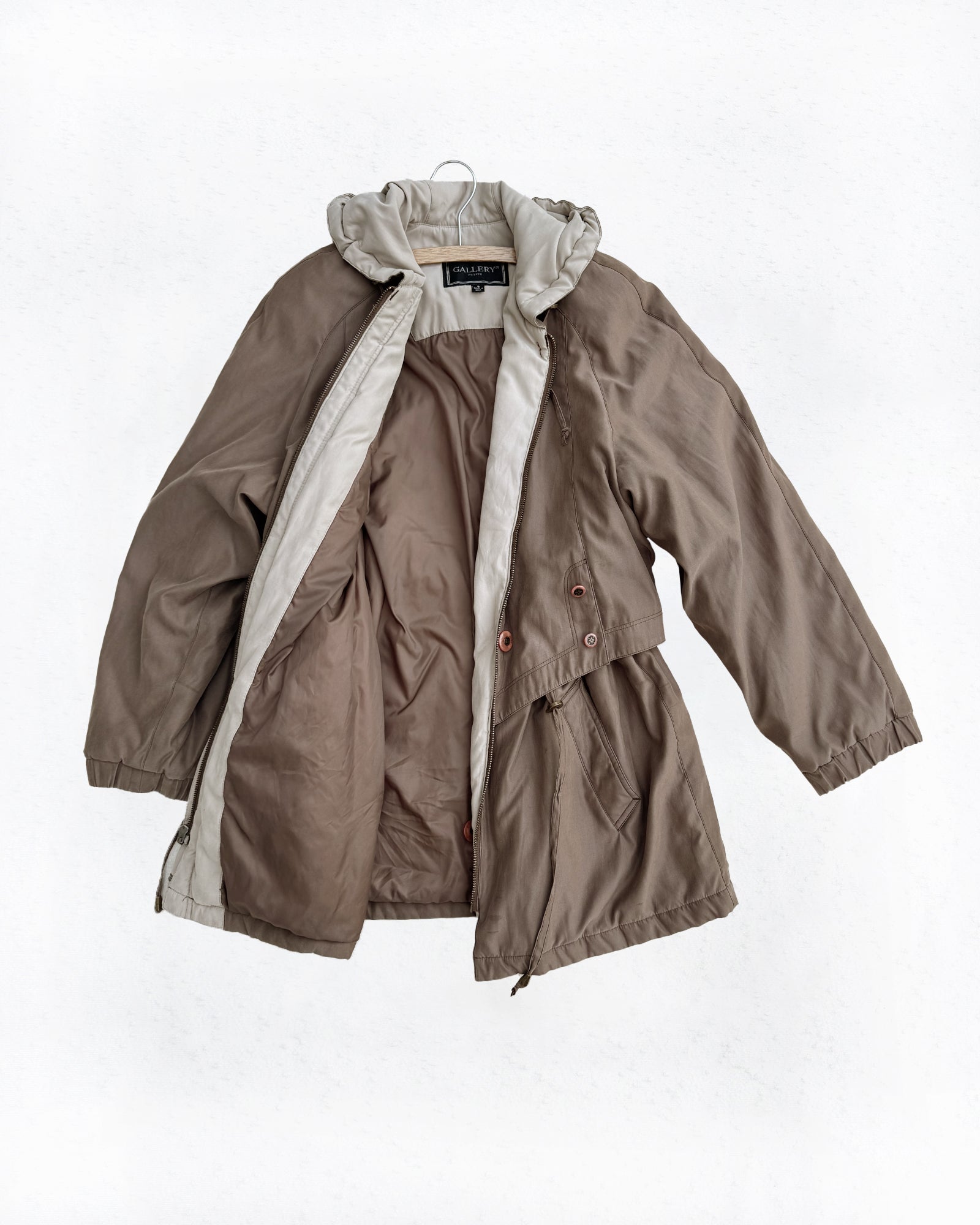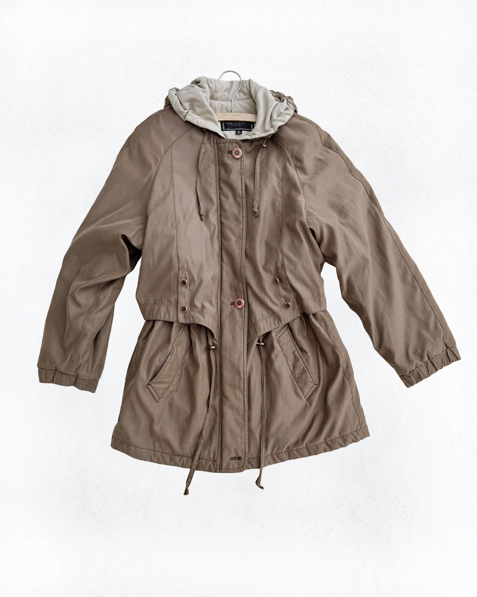Lightly insulated soft material featuring both a cinch-able waist and cinch-able hood for a customizable fit, along with a secure zip and button closure. The coat also includes convenient front pockets, making this muted brown coat a must for the cooler weather.
