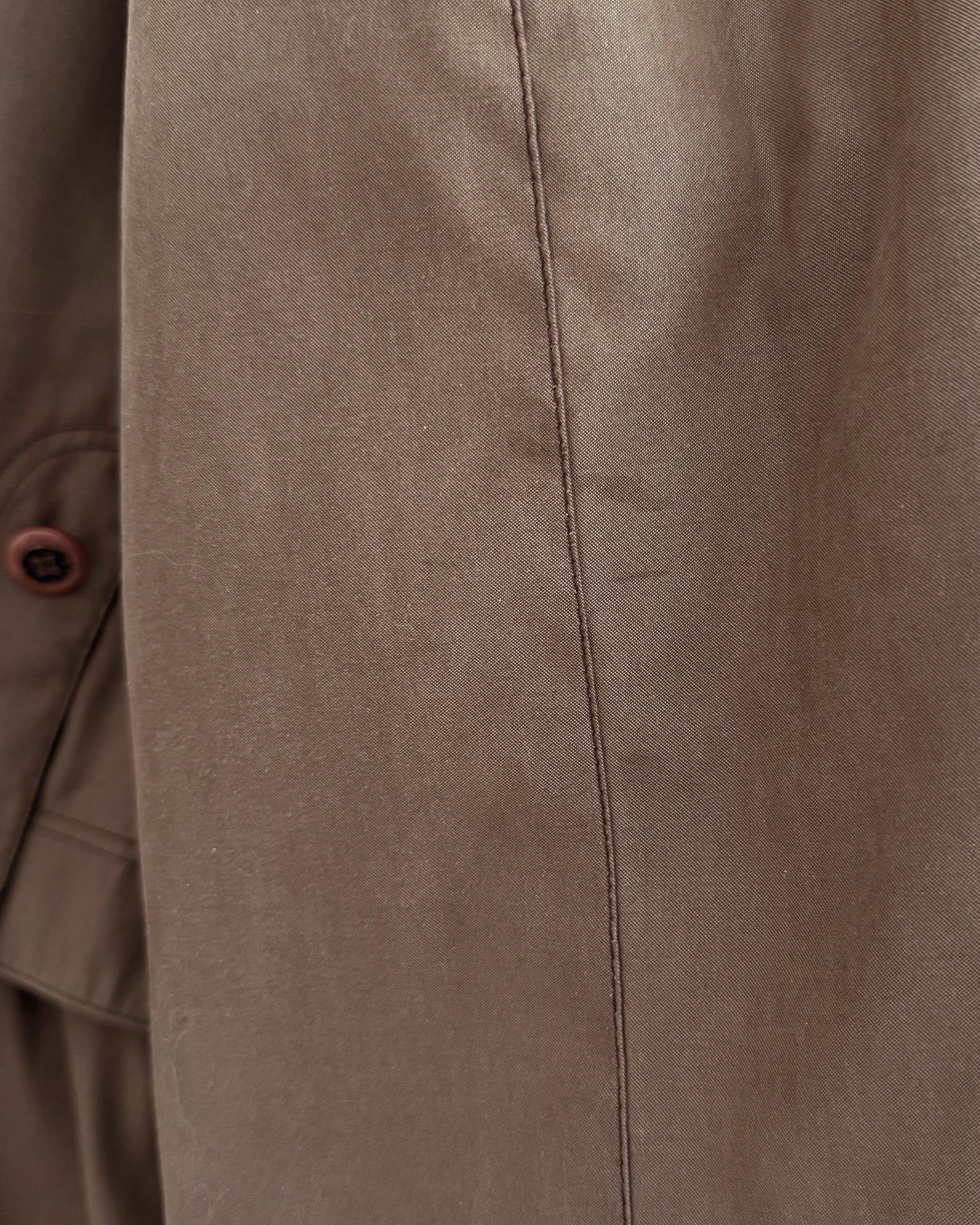 The construction of the coat is in excellent condition, with minor thread loss at the right pocket. The bottom button is missing, but an extra is included inside should you wish to replace it. Small stains are present throughout and are shown in close-up photos. Coat is priced accounting for these blemishes. These marks do not detract from its overall appearance, and the coat remains ready to wear.