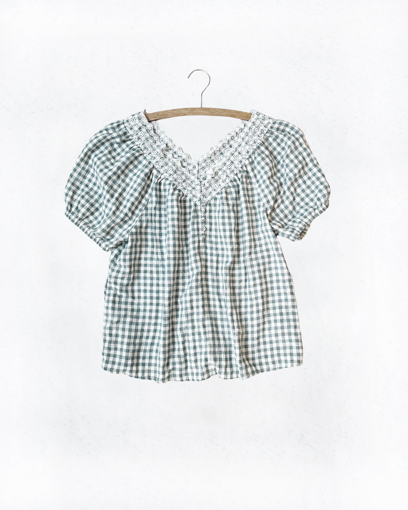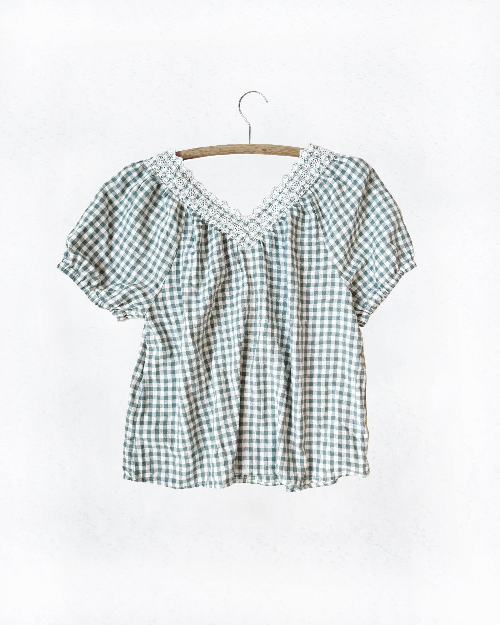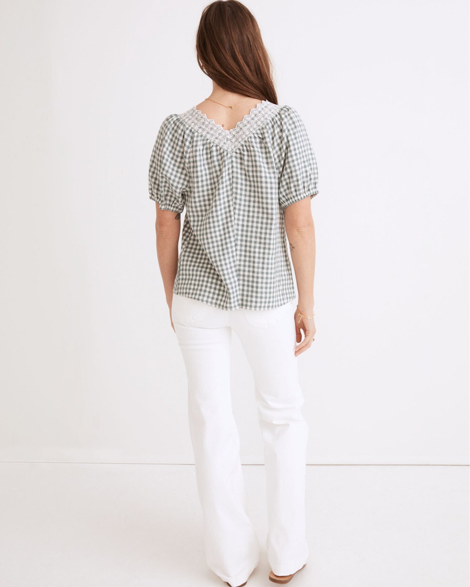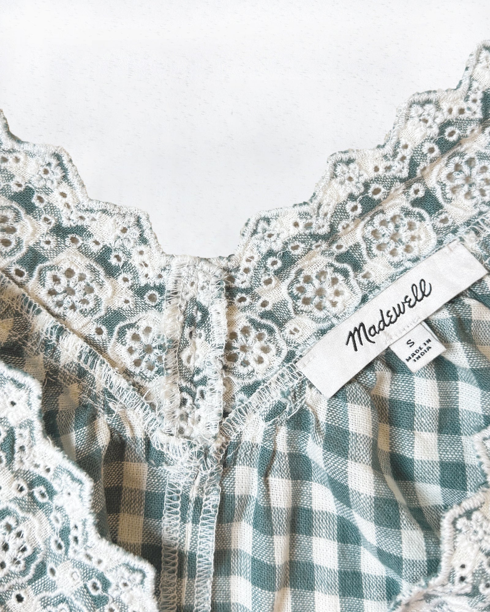 This gingham top features a linen blend, covered buttons, puff sleeves, and a scalloped embroidered neckline. It would make a perfect addition for a comfortable yet classy Thanksgiving outfit.