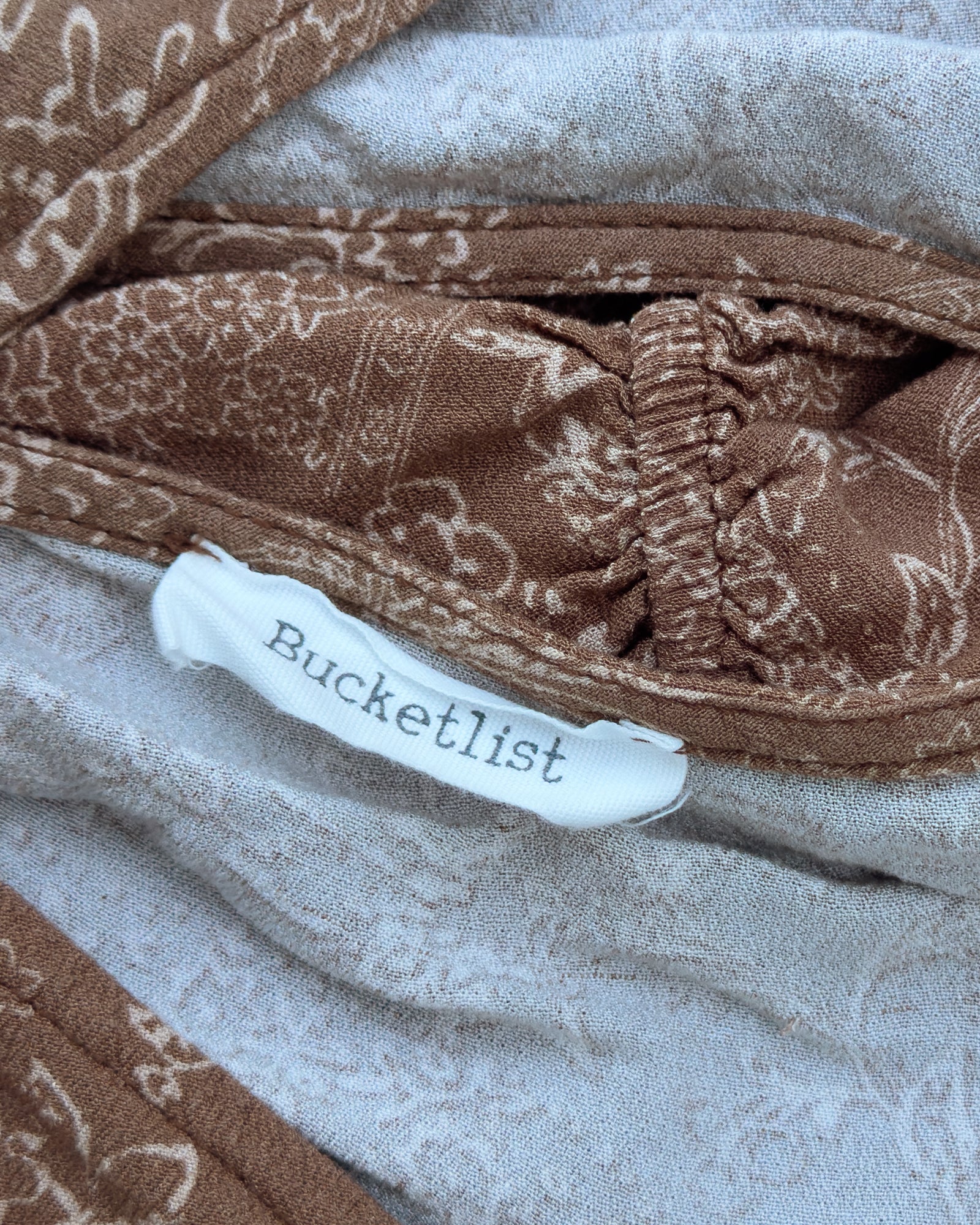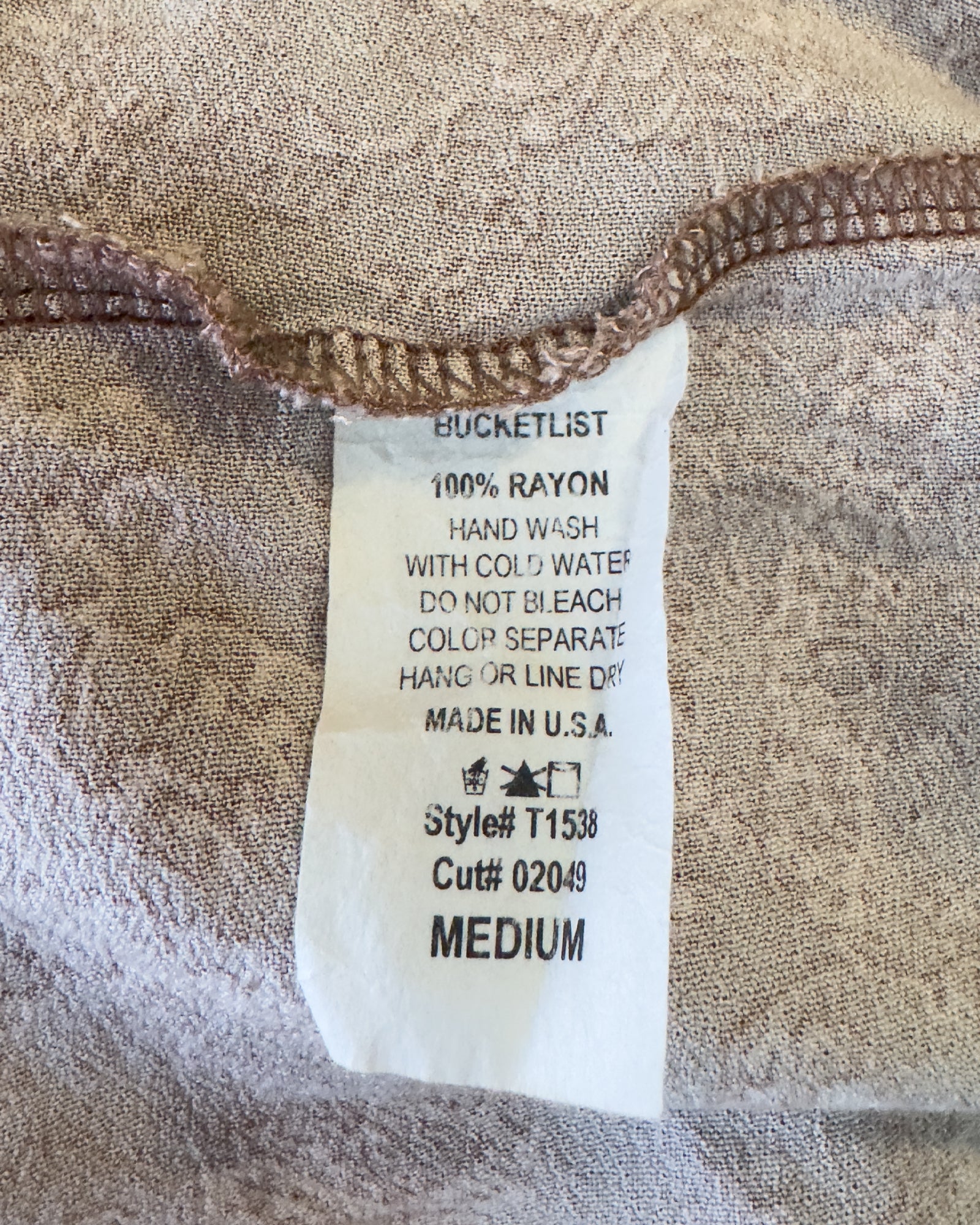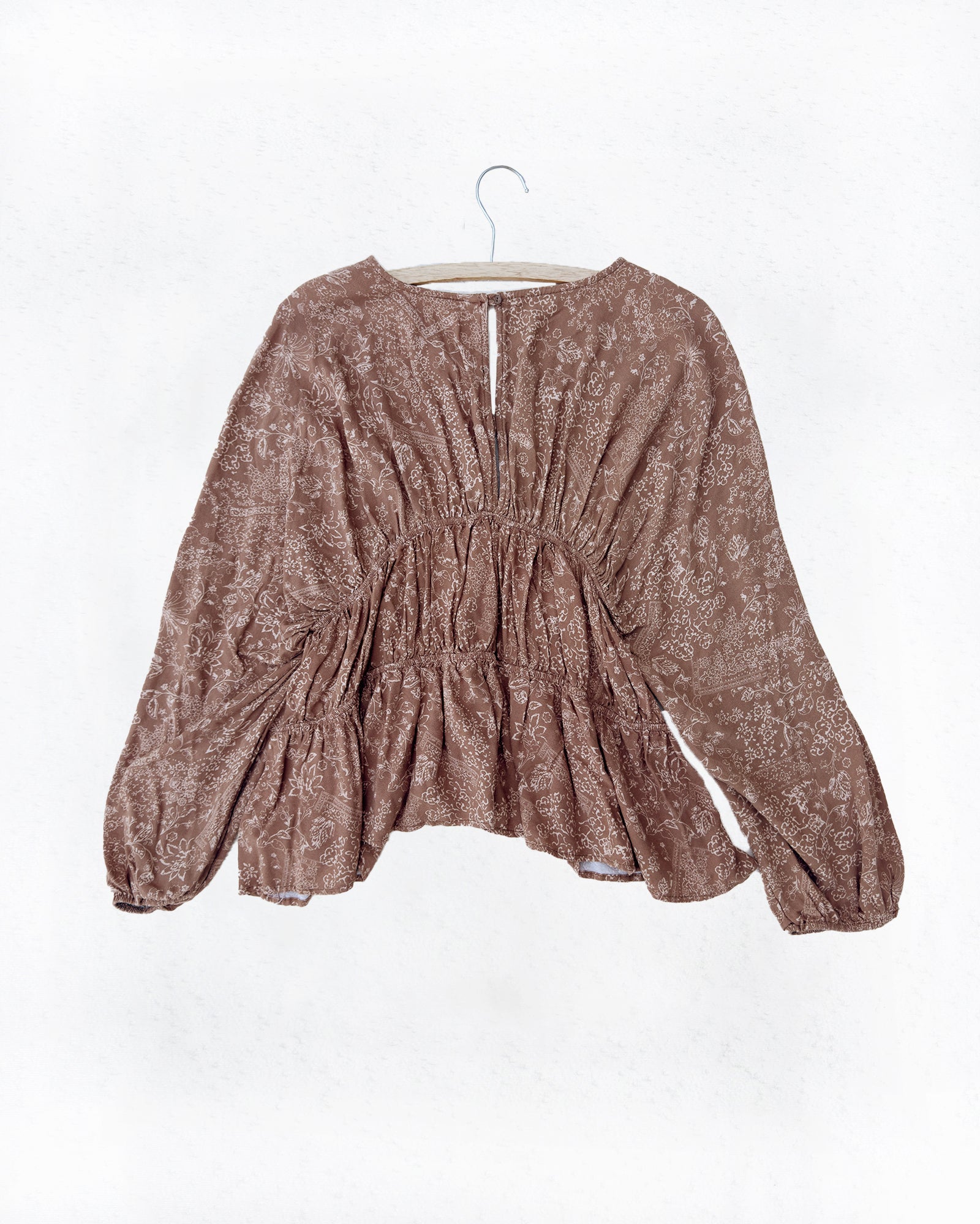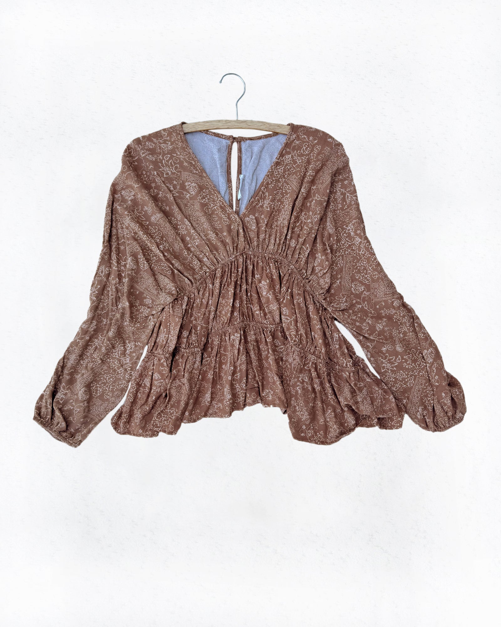 This floral V-neck blouse showcases elegant shirred detailing, elastic cuffs, and a keyhole back closure. Please note: the neckline plunges to the first shirred line at mid-chest, which may appear higher in photos due to pinning. Similarly, the back keyhole extends down to the first shirred line, though this may be difficult to discern in images. Be sure to check measurements to ensure your preferred fit.